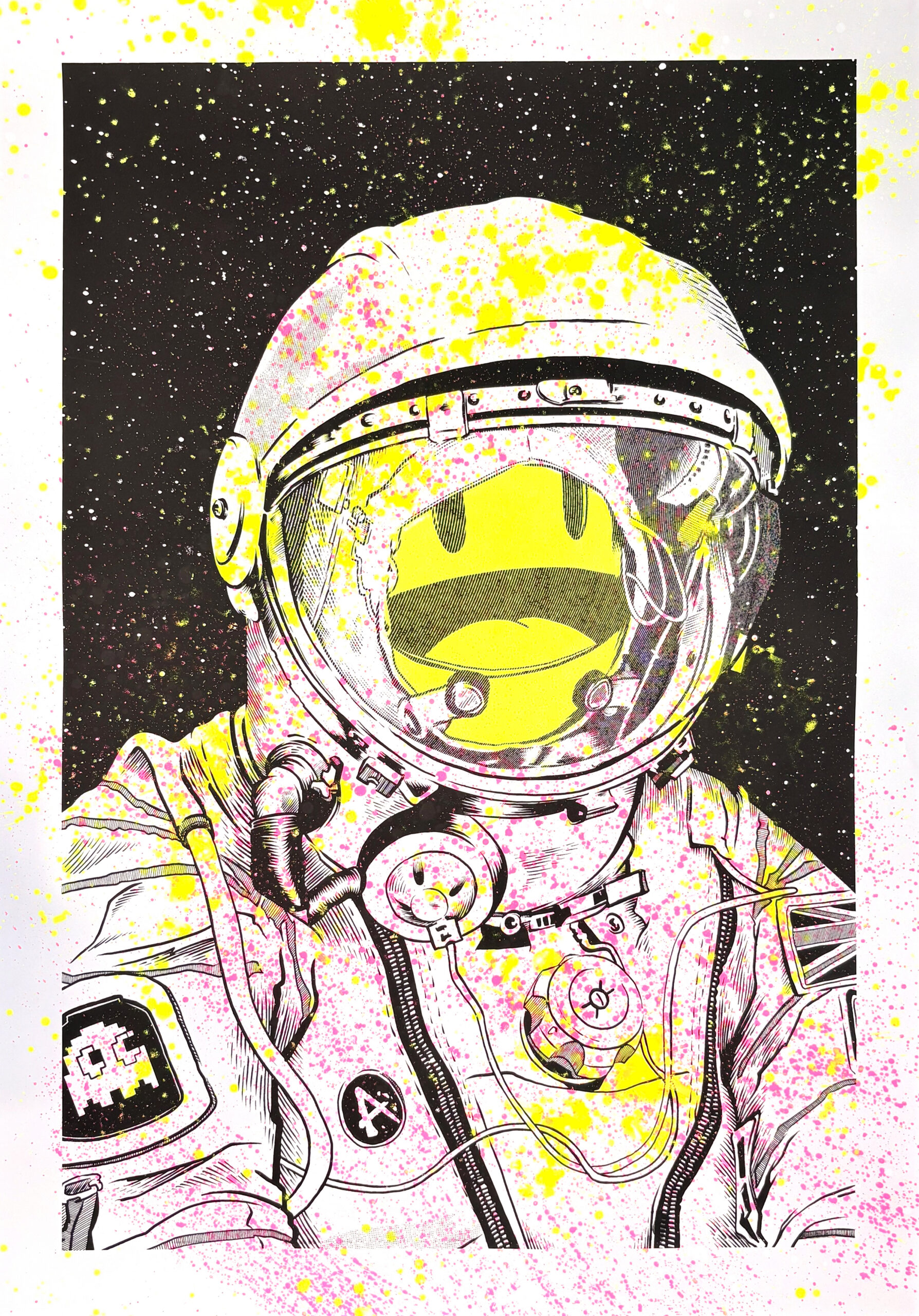 Der Pacmonaut errinnert die Alten unter uns an ihre Jugend und die Jungen unter uns denken: „Cool ein Weltraum-Smiley!“ Eine echte Win Win Situation die es so selten am Kunstmarkt zu sehen gibt. Jeder Druck ist ein handgefertigtes Unikat. Wir haben zunächst auf verschiedene Weise das Papier mit Farb-Drips, Pinsel, Rakel und allerhand anderem Gerät bearbeitet und anschließend das Motiv im Siebdruckverfahren per Hand gedruckt. Für diese Unikate sind wir mit 100x70cm an die Größenlimits unseres Drucktischs gegangen.
