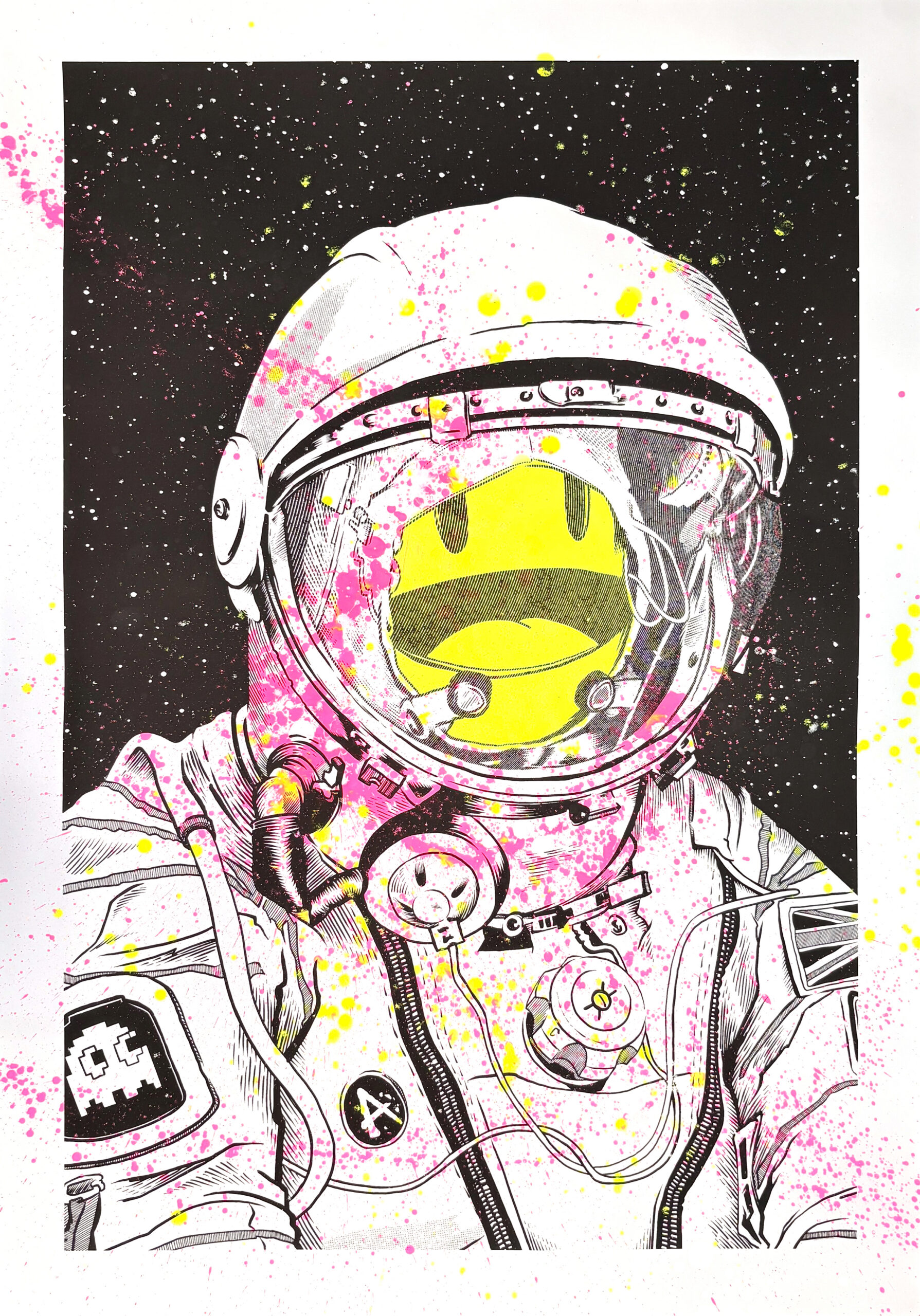 Der Pacmonaut errinnert die Alten unter uns an ihre Jugend und die Jungen unter uns denken: „Cool ein Weltraum-Smiley!“ Eine echte Win Win Situation die es so selten am Kunstmarkt zu sehen gibt. Jeder Druck ist ein handgefertigtes Unikat. Wir haben zunächst auf verschiedene Weise das Papier mit Farb-Drips, Pinsel, Rakel und allerhand anderem Gerät bearbeitet und anschließend das Motiv im Siebdruckverfahren per Hand gedruckt.  Für diese Unikate sind wir mit 100x70cm an die Größenlimits unseres Drucktischs gegangen.